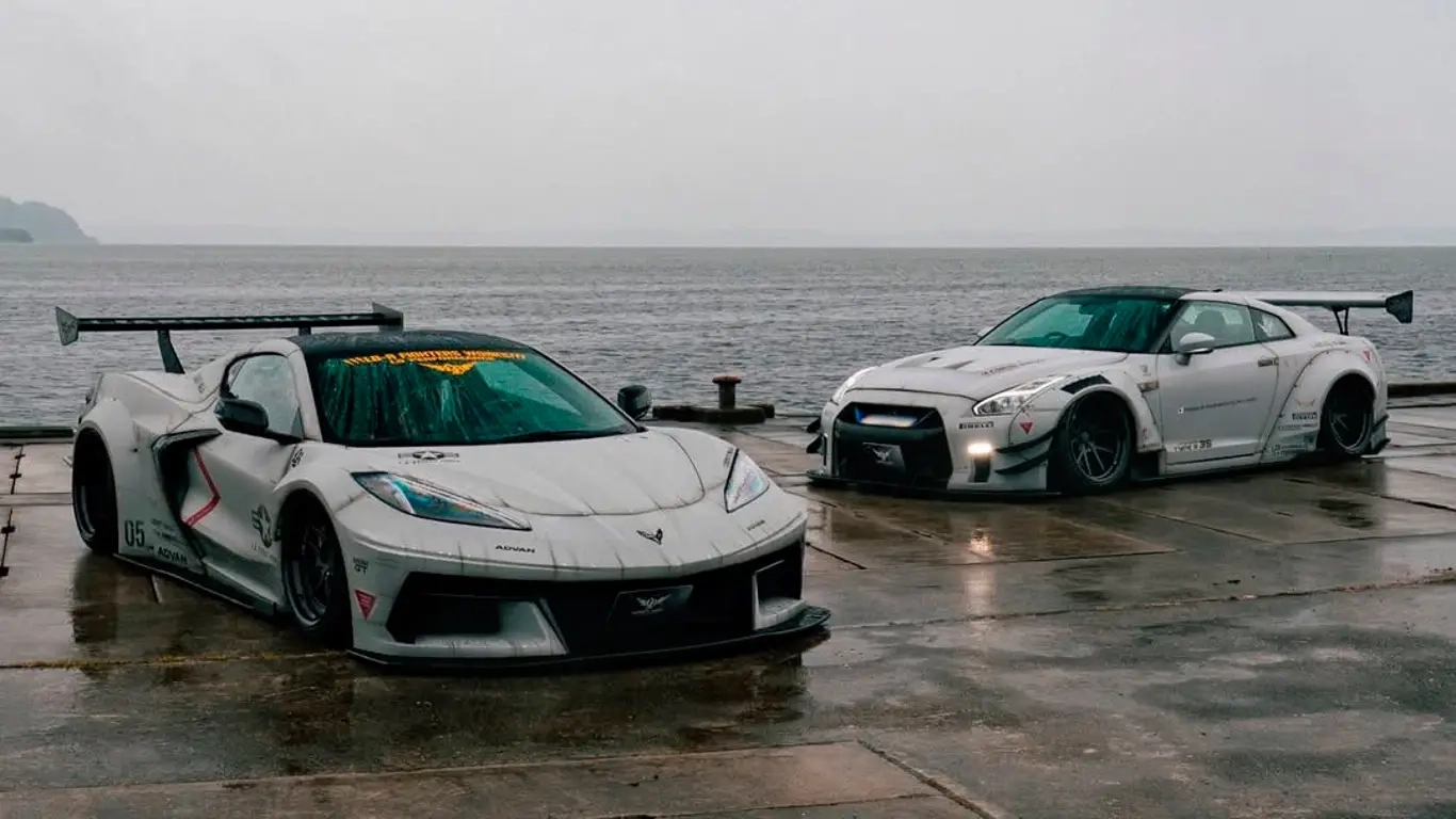 리버티 워크 콜벳 C8과 닛산 GT-R, 와이드바디로 빚은 해안가 쇼다운
