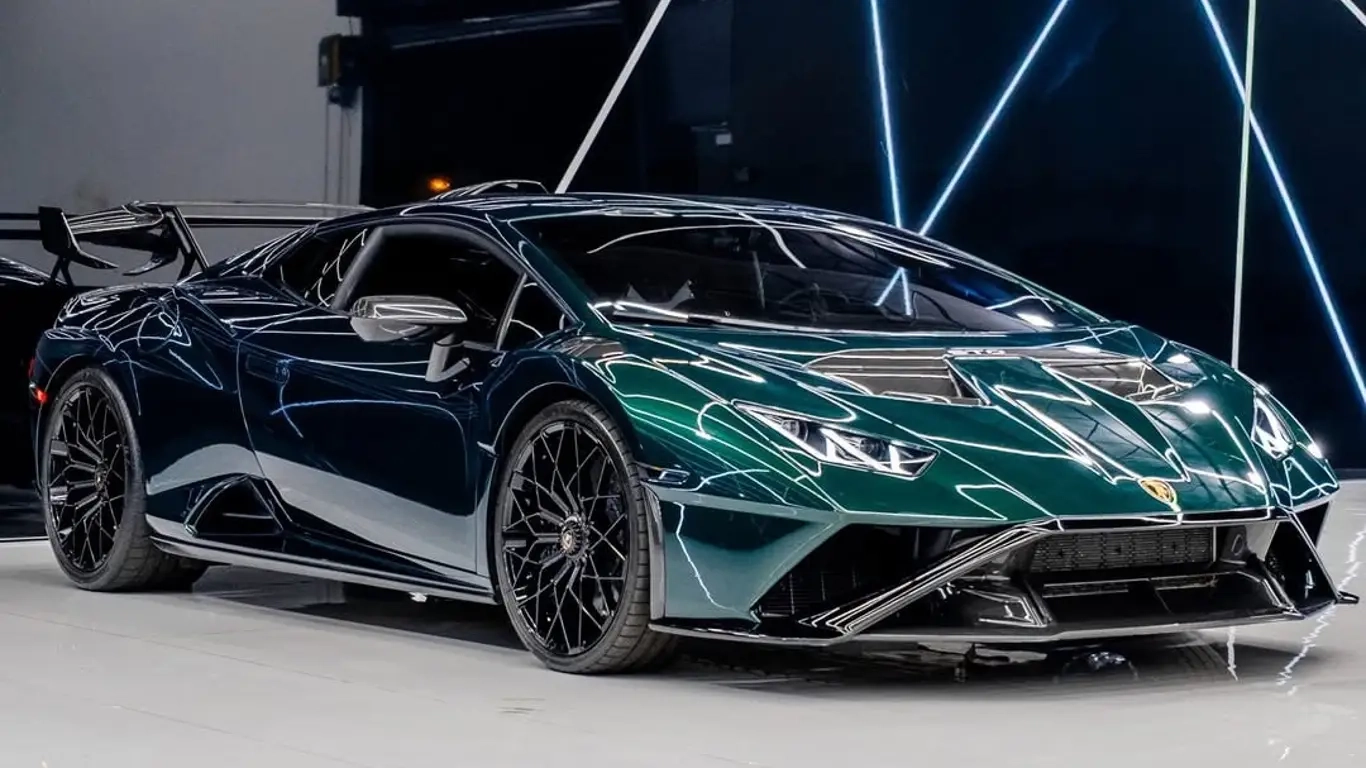 베르데 히드라 컬러의 람보르기니 우라칸 STO 중고 매물. 5.2리터 V10 631마력, 후륜구동, 0-100 3.0초, 최고 310km/h. 주행 8,000km, 희귀 색상, 가격 435,980달러. 브리티시 레이싱 그린을 떠올리는 우아한 외장, 서킷 지향 세팅 그대로.