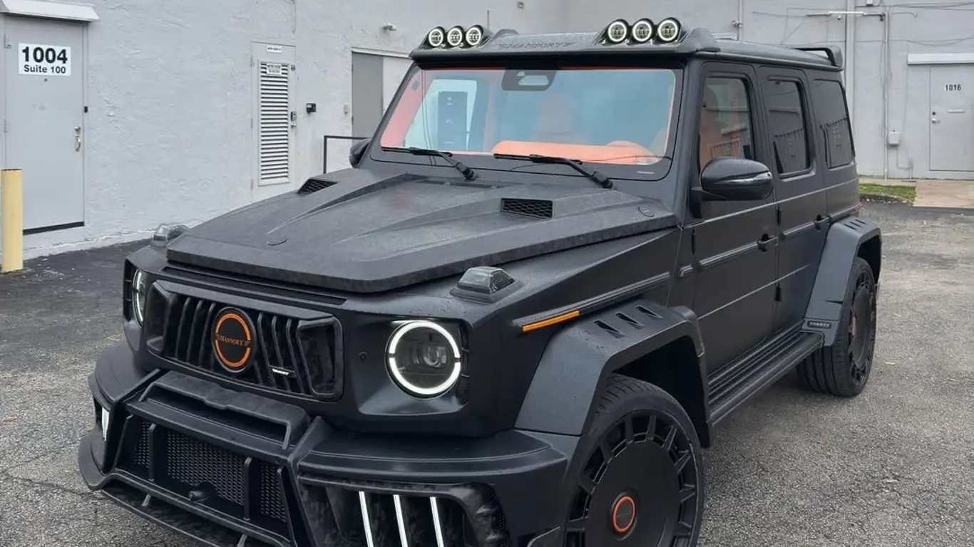 Kabina jest niemal w całości wyłożona jasnopomarańczową skórą, która pokrywa fotele, panele drzwiowe, deskę rozdzielczą i konsolę środkową. W wykończeniu wykorzystano elementy z karbonu kute oraz charakterystyczne akcenty Mansory, tworząc ostry kontrast z surowymi liniami nadwozia na zewnątrz.