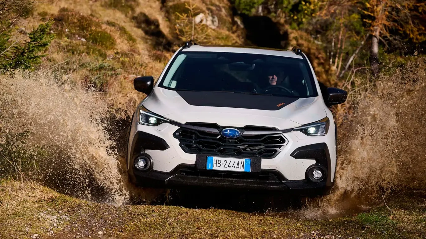 Poznaj Subaru Crosstrek 4WILD: specjalny wariant z osłonami i matowymi felgami. Hybryda 2.0, AWD z X‑Mode, prześwit 220 mm – idealny na miasto i szutry.
