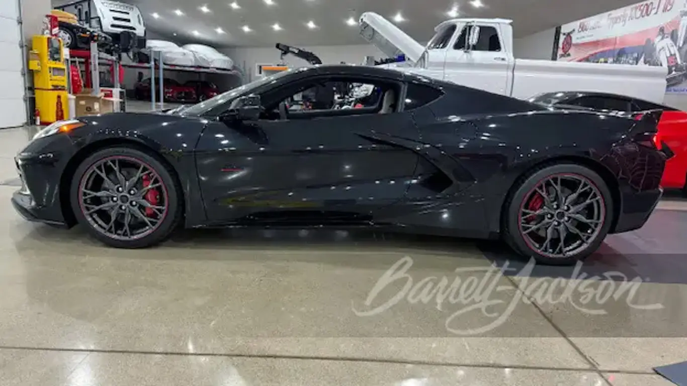 Технически это Corvette Stingray с атмосферным V8 6.2 LT2 мощностью 495 л.с. в спецификации Z51, с производительным выхлопом, перенастроенной трансмиссией и подвеской Magnetic Ride Control. То есть перед нами не только памятный номер, но и полноценная версия, рассчитанная на трековые нагрузки.