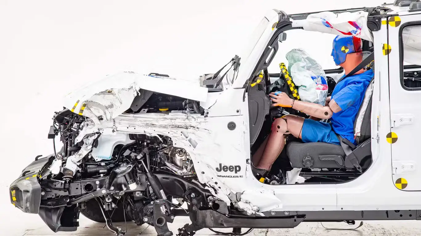 Jeep наконец решил проблему, преследовавшую Wrangler с 2019 года: модель стабильно переворачивалась в краш-тесте IIHS «малое перекрытие с водительской стороны». Испытания 2019 и 2022 годов показывали высокий риск опрокидывания — результат сочетания узкой колеи, высокого центра тяжести и конструктивных особенностей передней части рамы.